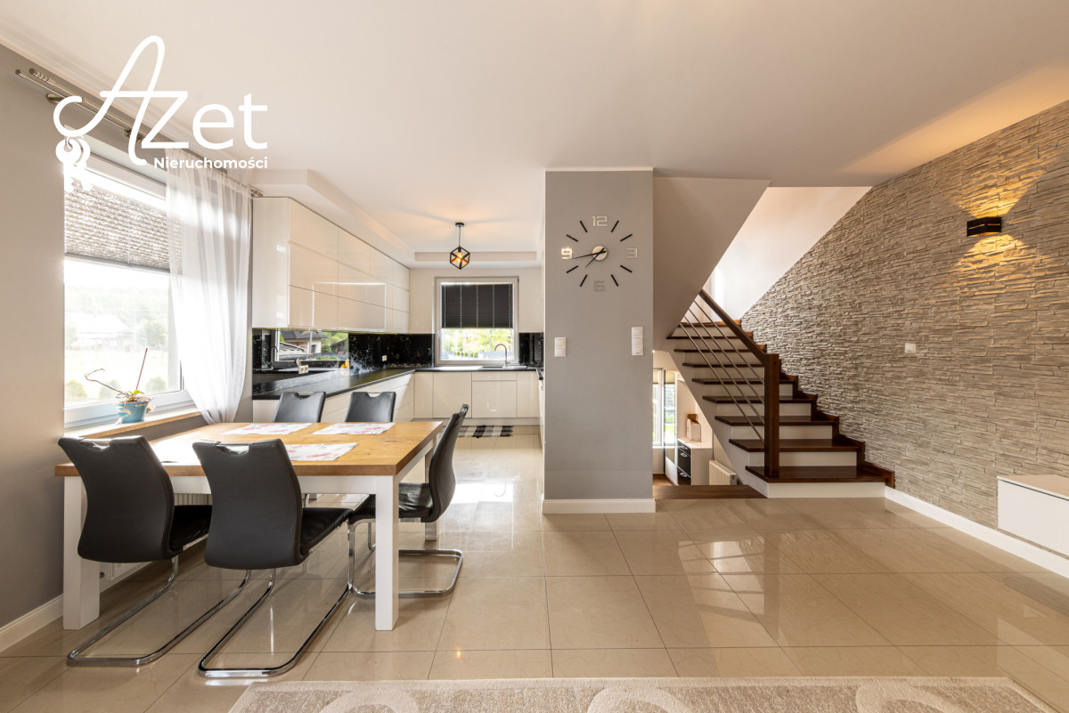 Już od progu wita Cię przestronny, jasny salon - idealne miejsce na wspólne chwile z rodziną i przyjaciółmi. Duże okna zapewniają naturalne światło przez cały dzień, a bezpośrednie wyjście do ogrodu sprawia, że natura staje się częścią Twojej codzienności. Salon płynnie łączy się z funkcjonalną kuchnią - gotowanie tu to czysta przyjemność!